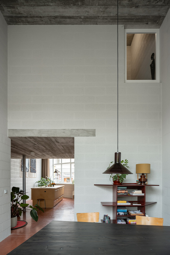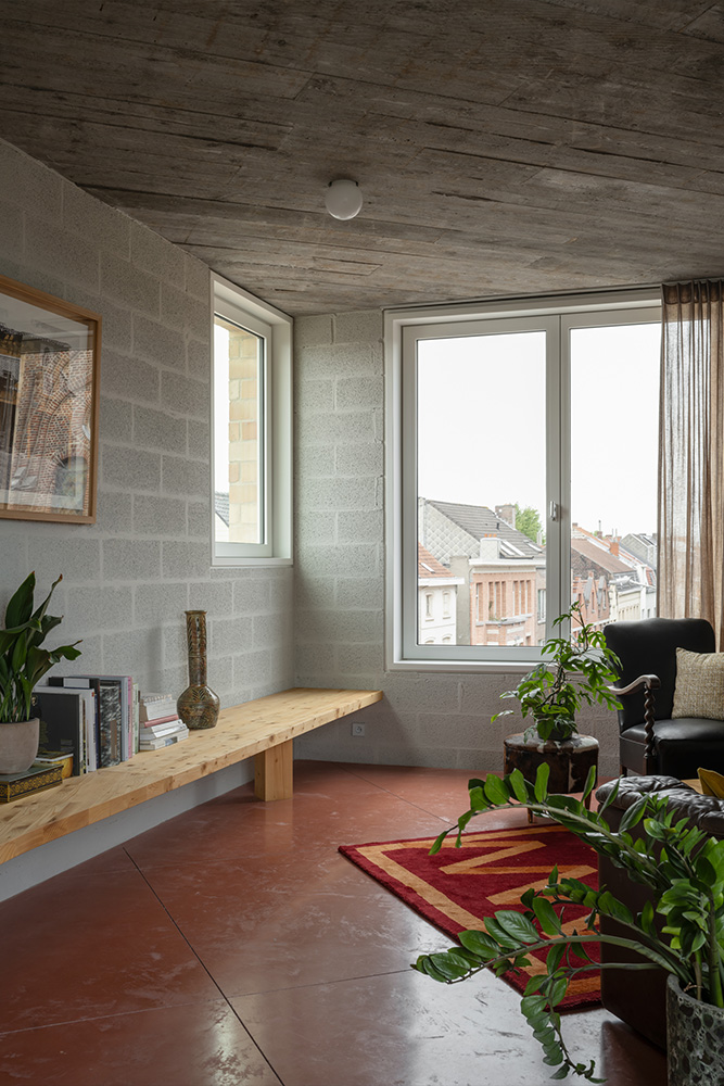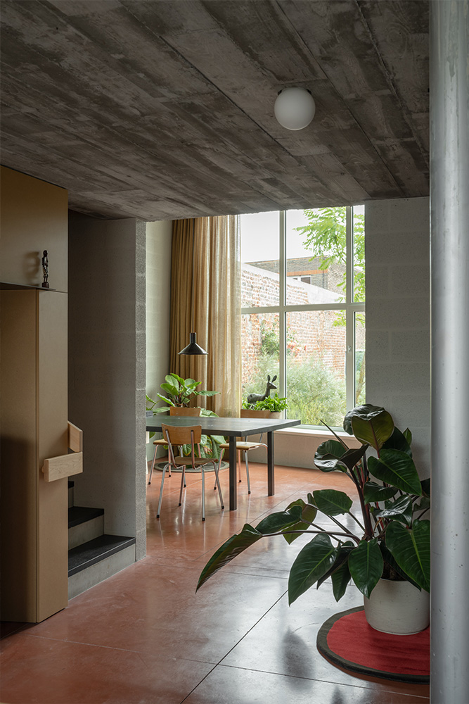 In plaats van de typisch Vlaamse achterbouwen, wordt bewust verticaal gebouwd, zoals bij een herenhuis. Zo krijgt het wonen opnieuw evenveel uitstraling naar voor als naar achter. De raamopeningen in voor- en achtergevel zijn vrijwel identiek, waardoor de woning zich niet naar één kant keert. Het nieuwbouwvolume is niet generiek, maar nadrukkelijk specifiek ontworpen: een massief, sculpturaal geheel met duidelijke identiteit. Het symmetrische plan met traveeën buigt subtiel mee met de hoekige perceelvorm. Binnen zorgt een verticale openheid voor een stedelijk ruimtelijk gevoel, aangevuld met vlakken, nissen, zichten, balkons en een robuuste materialisatie van zichtbaar beton, hout en steen.