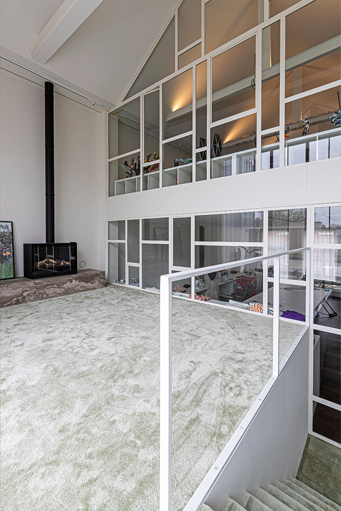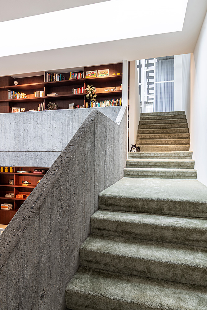 Het interieur combineert tijdloze jaren ’50-invloeden, sapelli fineer, Verde St Lucia-marmer en een gestroomlijnde microtopping-vloer. Grote glaspartijen brengen daglicht diep binnen, terwijl warme houttonen en koele steen zorgen voor een verfijnd spanningsveld.